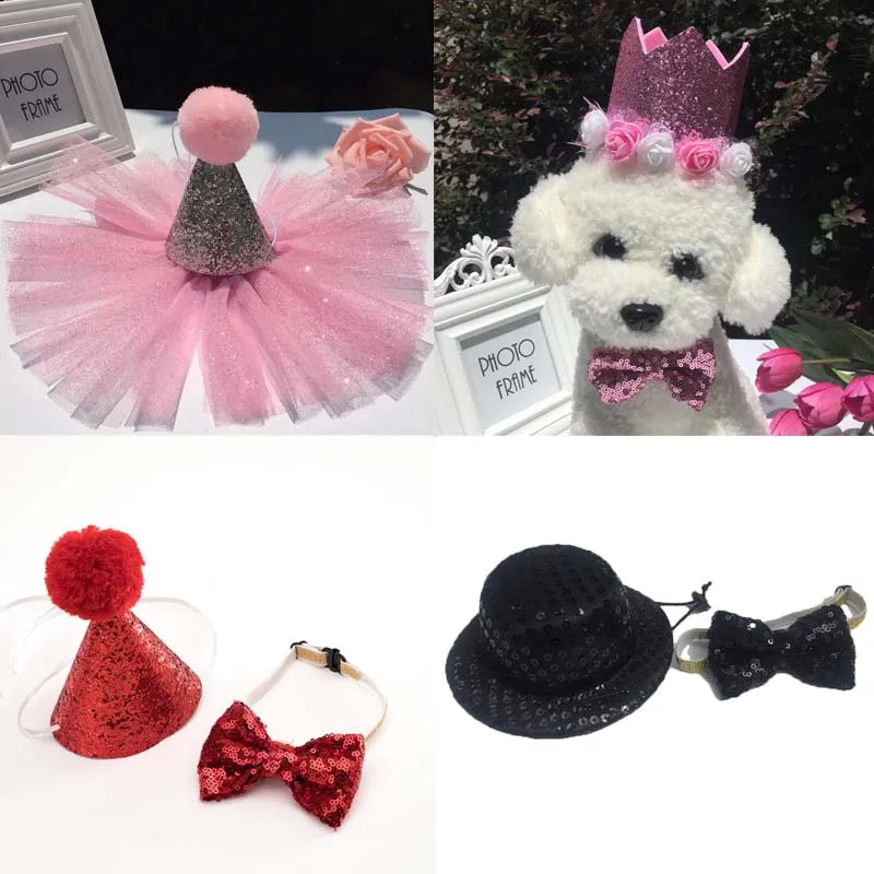 .Pictures for Kids Pet Dogs Caps Bowknot Crown Lace Cat Dog Birthday Costume Sequin Design Headwear Cap Hat Christmas Party Pets Accessories